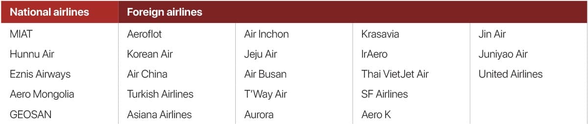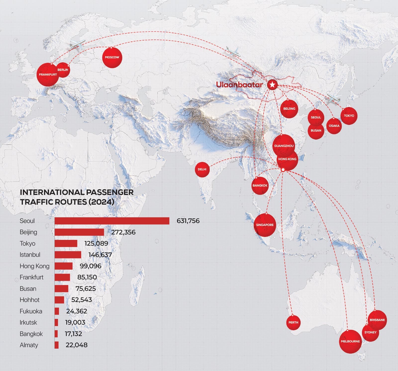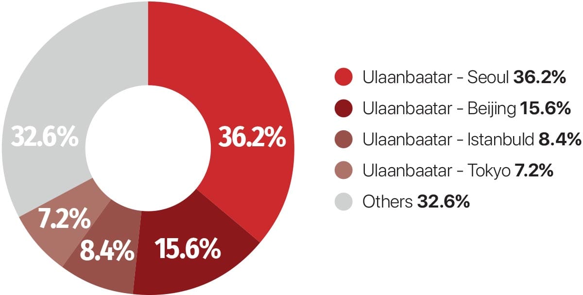 As of 2024, a total of 132 route designations were granted to air carriers for 57 cities across 26 countries. Domestic airlines accounted for 78.2% of international passenger transport, operated by five Mongolian carriers.
