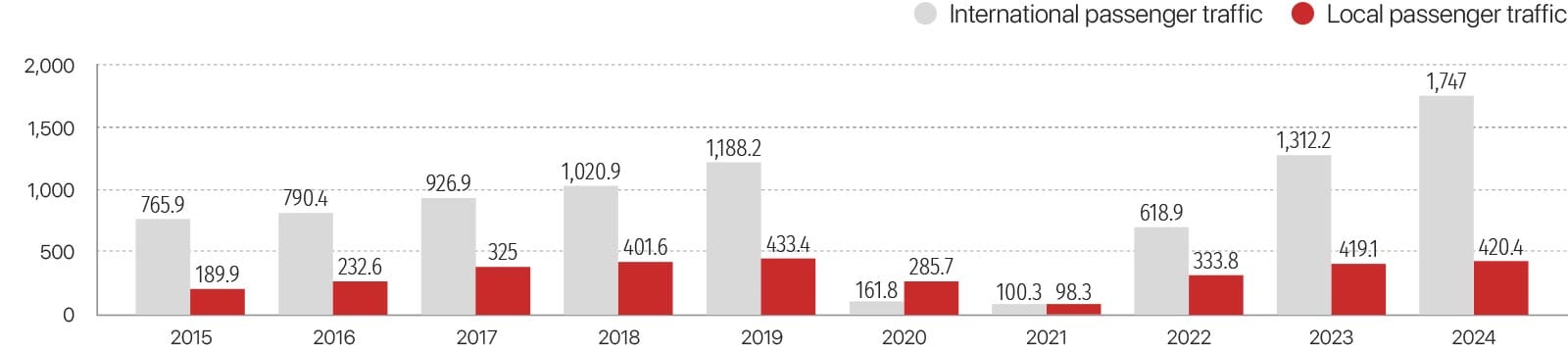 The Chinggis Khaan International Airport, located 52 km from Ulaanbaatar, became operational in 2021. The airport welcomed more than 2 million passengers in 2024. It has a daily capacity to handle 139 flights or 12,000 passengers, with an annual capacity of 3 million passengers.