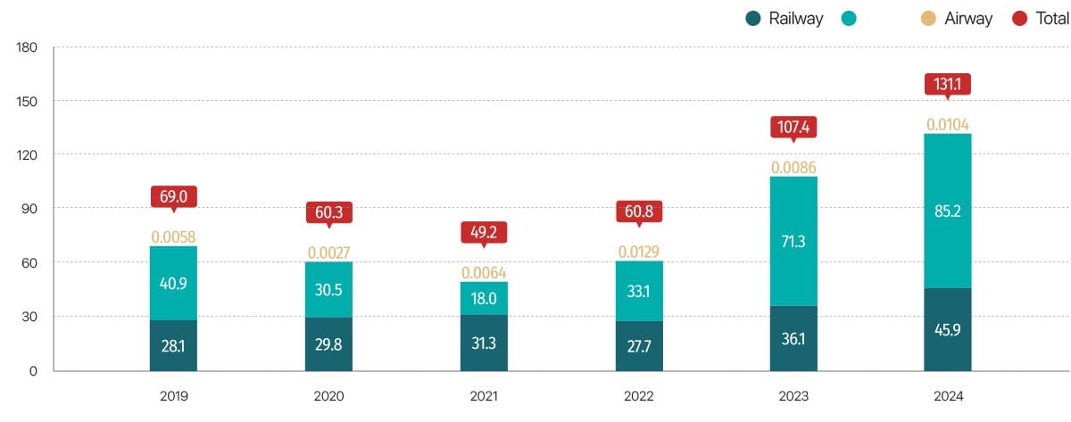 The construction of 6.9 km long railroad connecting Shiveekhuren to Ceke Border Point had been completed in 2024, and the operation is expected to start soon. By the end of 2024, new border infrastructure was commissioned to support the export of mining products, increasing the port’s capacity by 10 million tons. In 2024, 26.5 million tons of coal were exported through this port, with another 26 million tons planned for 2025.