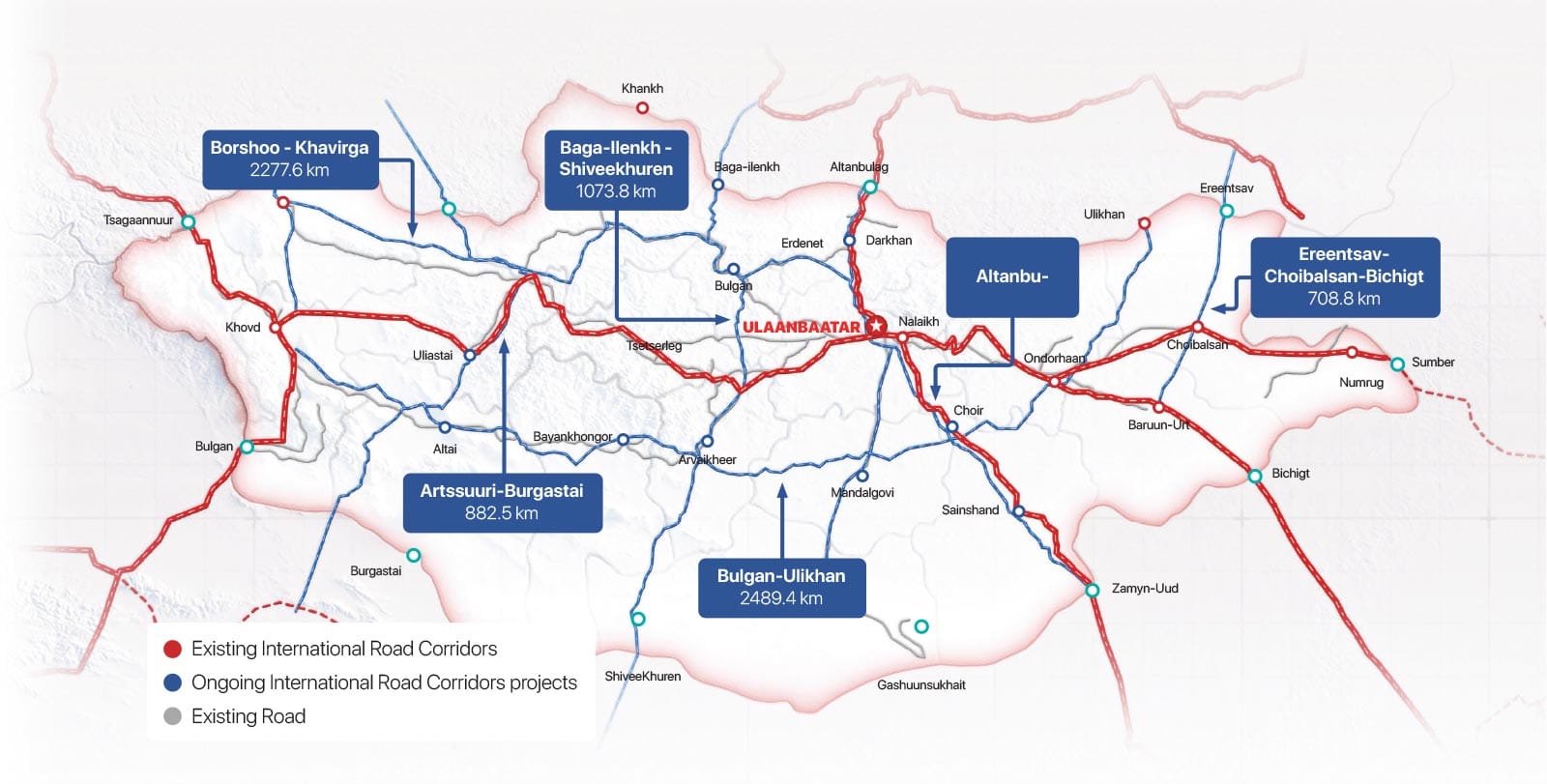 Mongolia boasts a total road network of 112,500 km, comprising 14,921.3 km of international and national standard roads, 96,700 km of local roads, and 898.4 km of special-purpose roads designed for mining commodity transport.