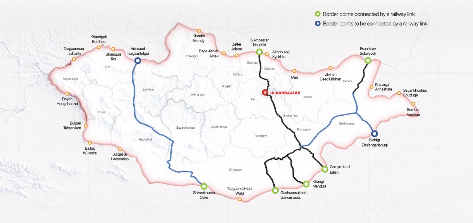 As of 2024, the railway network connects 8 provinces, 46 soums, and 3 border ports. The Altanbulag–Zamiin-Uud railway is the central economic corridor of Russia, Mongolia, and China and serves as the main infrastructure for transit, export, and import transportation.”