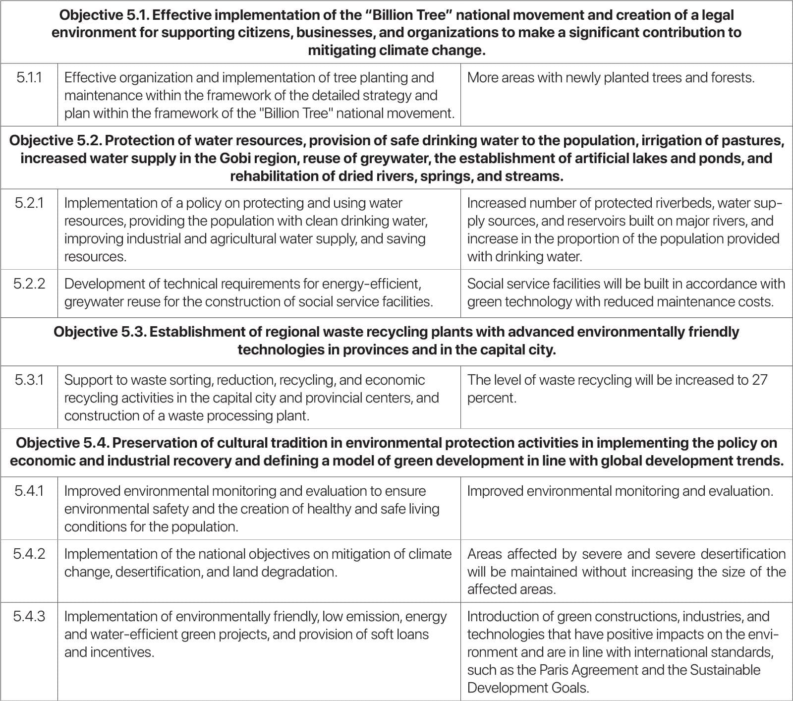 This objective includes measures to combat climate change. Within this frame, projects complementing the implementation of the Billion Tree movement initiated by the President of Mongolia by 2030 will be carried out.