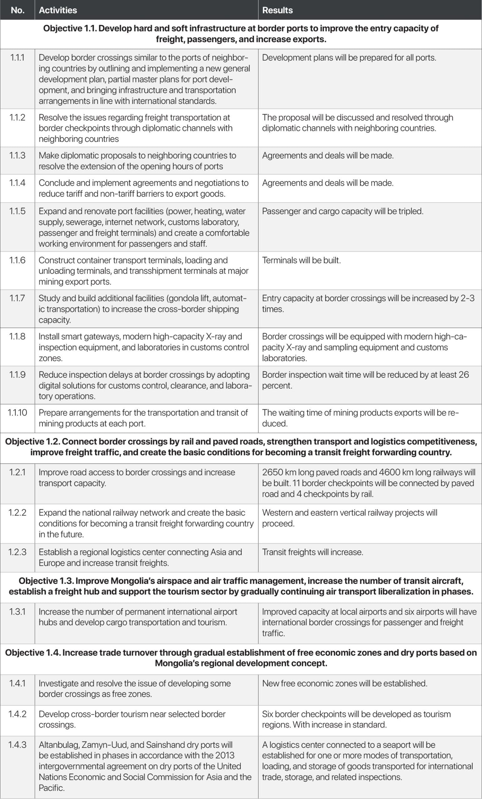 Construction of an international transit highway in the Zamyn-Uud-Altanbulag route, and connectivity of border crossings with paved roads.
