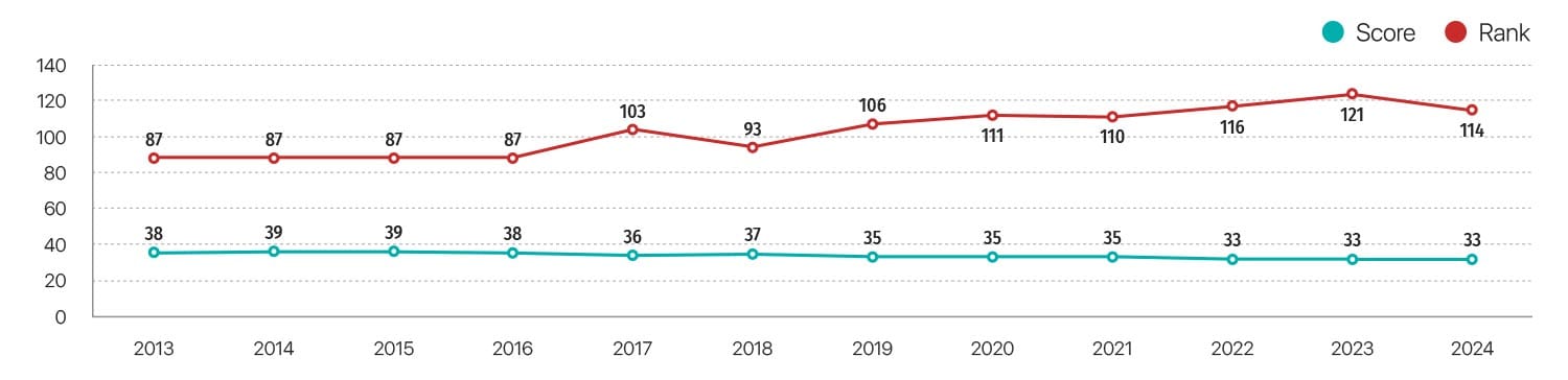 Mongolia continues to perform poorly on corruption index. In the 2024 Transparency International Corruption Perceptions Index, it scored 33 out of 100, ranking 114th out of 180 countries, where 100 indicates very clean and 0 represents highly corrupt.