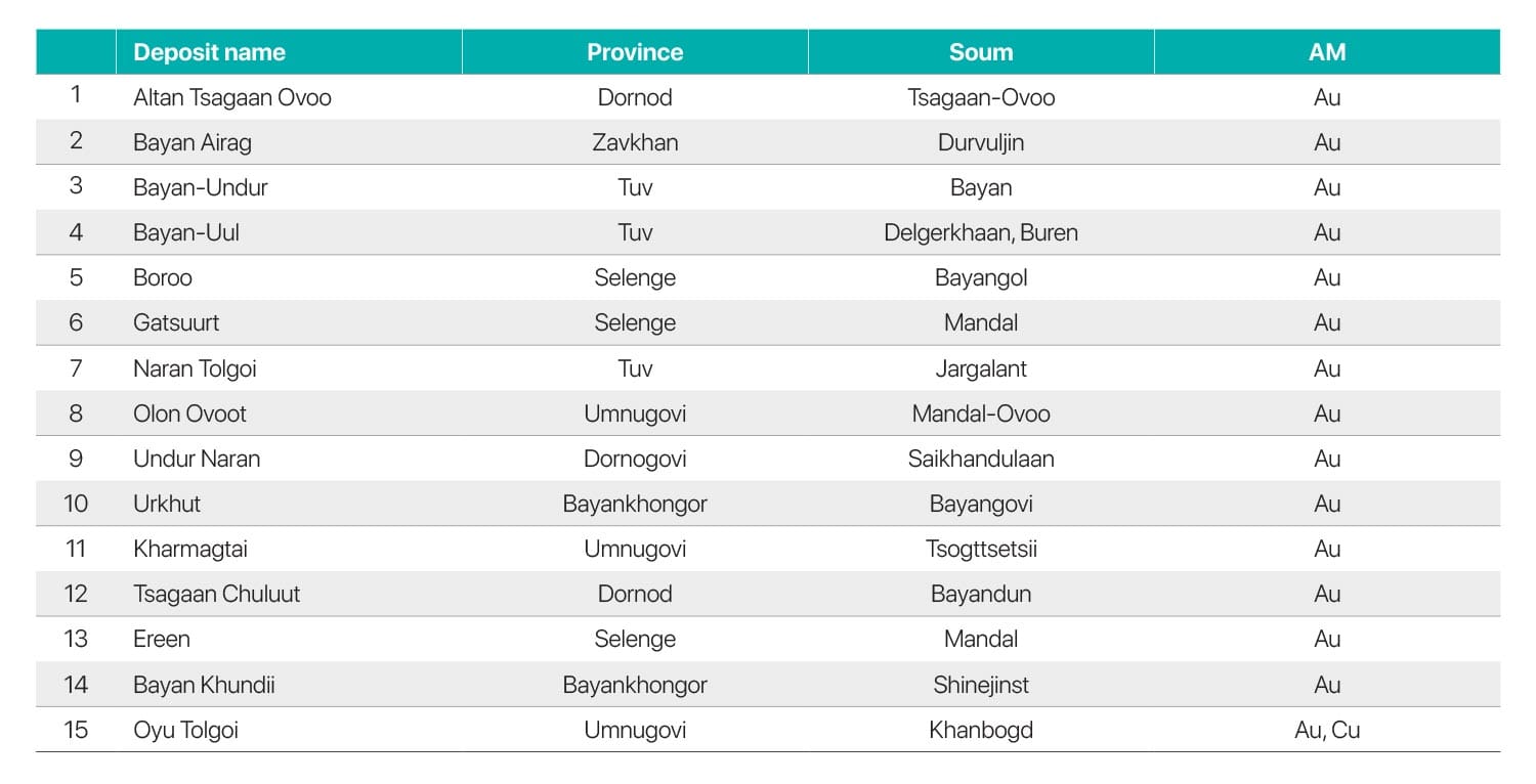 The number of registered hard rock deposits in Mongolia is the highest in Selenge, Tuv, and Umnugovi provinces. From the major mines, Boroo and Gatsuurt deposits are already depleted.