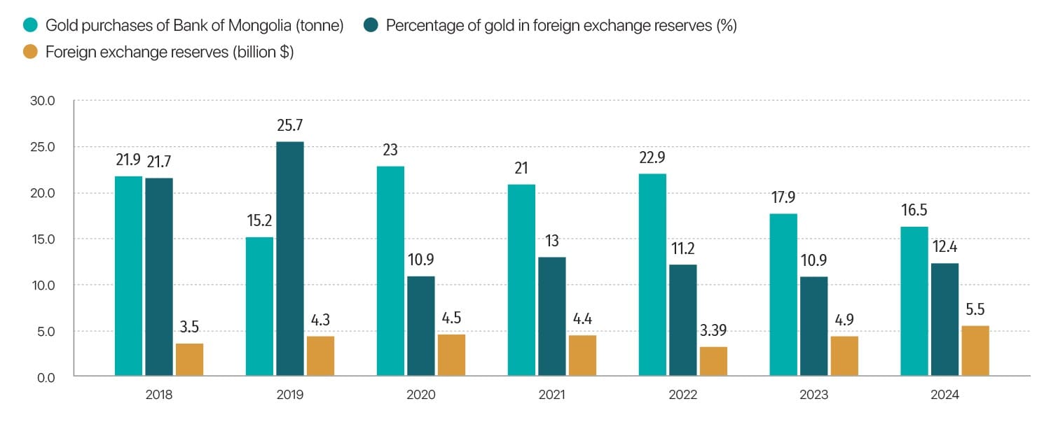 Over the past decade, the Bank of Mongolia has acquired over 200 tonnes of gold, bolstering the country’s foreign exchange reserves. In 2024, the Central Bank purchased 16.4 tonnes of gold, bringing foreign exchange reserves to $5.5 billion by year-end.