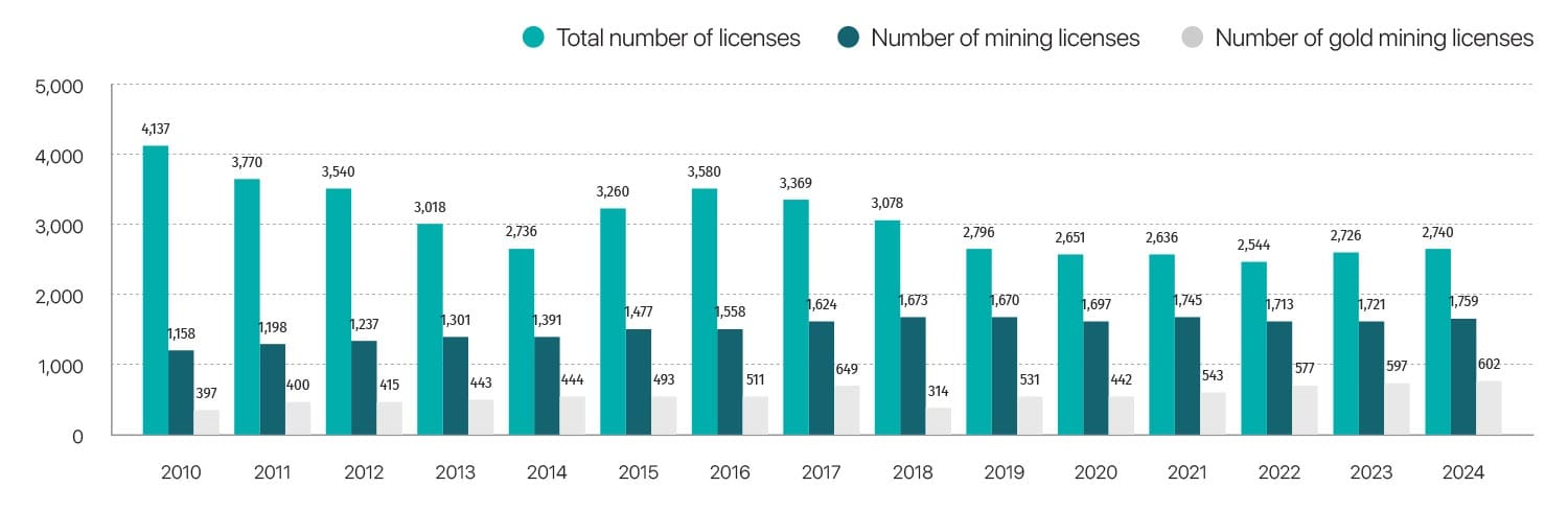 The number of mineral exploration licenses has been steadily declining. In 2016, there were 2,000 exploration licenses, but by 2022, this number had dropped to 831. This reduction is largely due to the shift from an application-based process to a tender system for granting exploration licenses. Since 2017, all exploration licenses have been issued only through a government organized tender process. While the competitive bidding system was intended to increase fairness, it has led to significant delays, a lack of transparency, and additional procedural hurdles, all of which have contributed to fewer new licenses being issued.