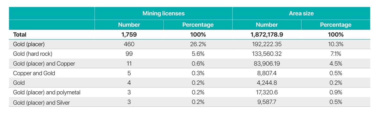 Throughout Mongolia, there are 460 valid mining licenses for placer mines and 99 for hard rock deposits of gold. In addition, licenses for gold-bearing metal deposits remain valid. In terms of quantity, placer gold accounts for the largest share of all mining licenses, accounting for 26%.