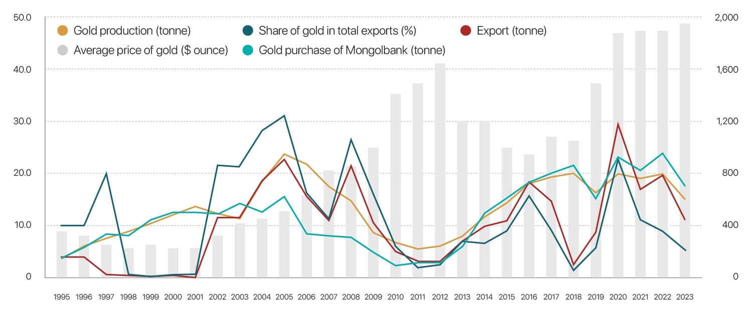 Since 1992, the gold production and mining in Mongolia has increased 26 times and the gold purchase by the central bank grew 10 times in the last decade. Gold industry accounted for 10% of mining production and 24% of Mongolia’s total export revenue in 2020. However, as of 2023, the sector accounted for 4.9% of export revenue, and 16.1% of foreign exchange reserves.