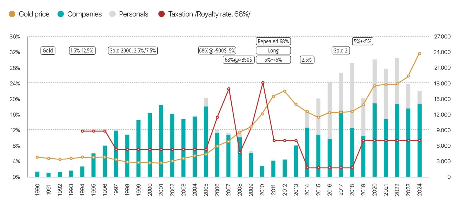 - 2008: Legalized tax rates of up to 68% in case price reaches $850 per ounce in accordance with Special Product Price Increase Tax Law
