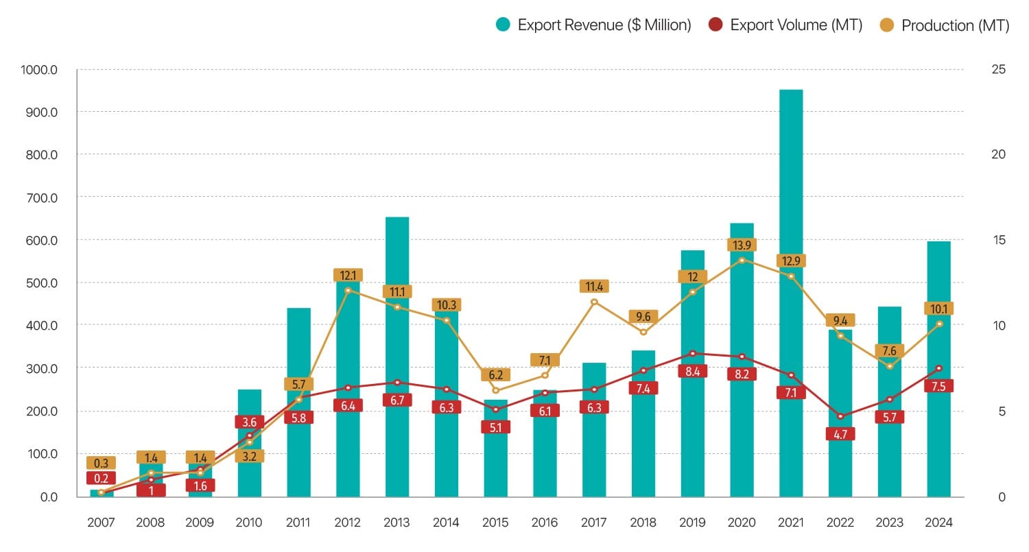 In 2024, iron ore exports accounted for 3.8% of total exports, reaching 7.5 million tonnes, which is a 31.5% increase compared to the previous year, while export revenue reached $601 million, marking a 35.8% increase compared to the previous year.In terms of annual production, a total of 10.1 million tonnes of iron ore and concentrates were produced, reflecting a 32% rise compared to the previous year.