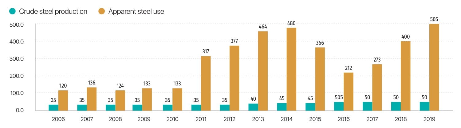 Currently, Mongolia’s steel production is lower than its consumption. The largest steelmaker is Darkhan Metallurgical Plant which uses local steel scraps for its steel production. Its capacity is 100,000 tonnes a year, but capacity usage is only 50-60%.