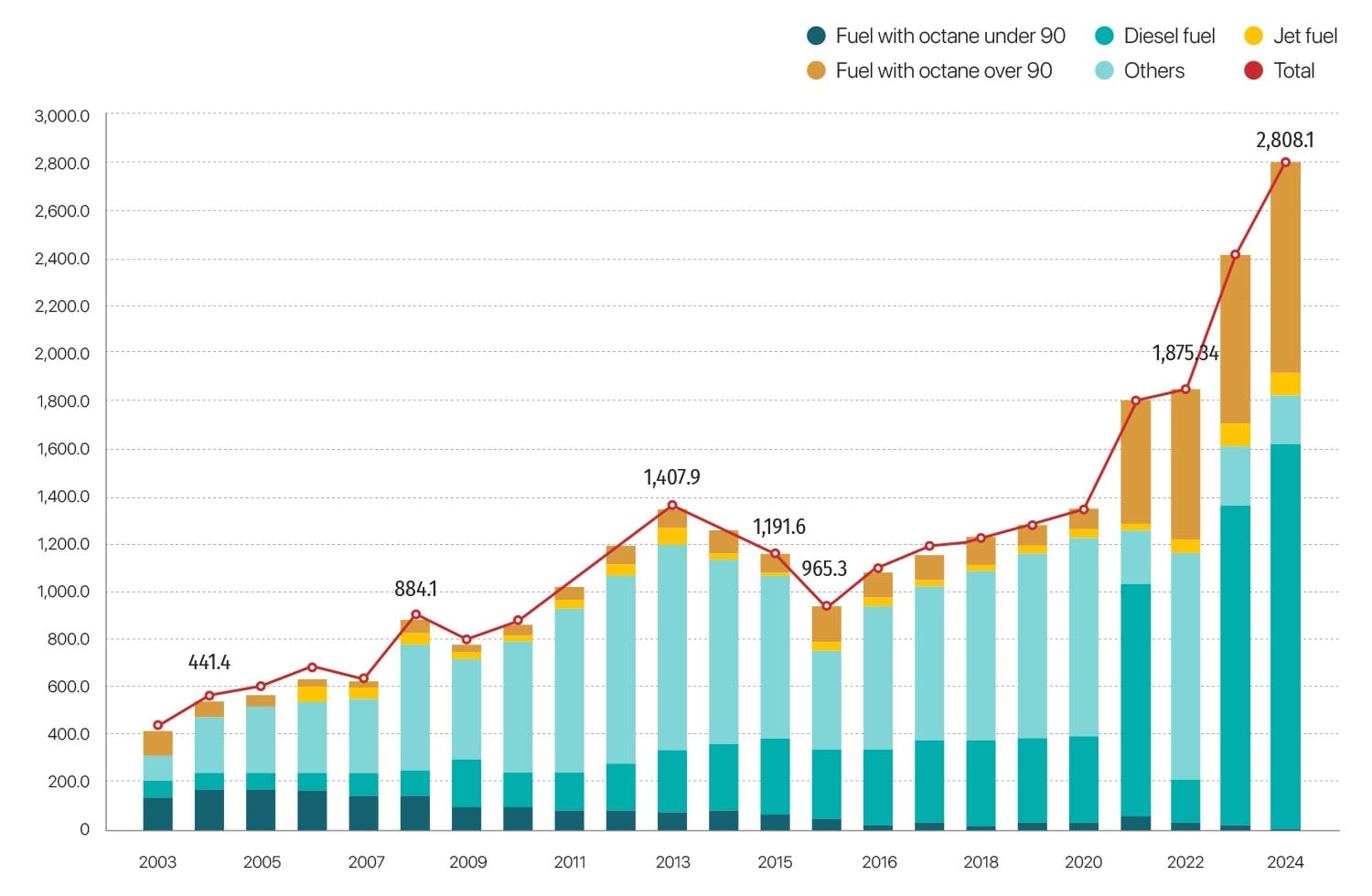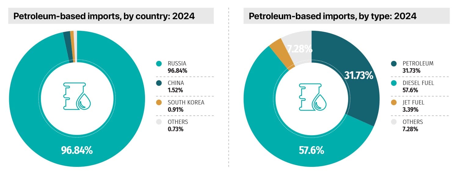 Mongolia’s fuel consumption is fully reliant on imports, with an average of two million tonnes of oil products are imported annually. This number has increased to 2.7 million tonnes in 2024. More than 90% is imported by Russia’s state-owned Rosneft and the rest from China and South Korea.